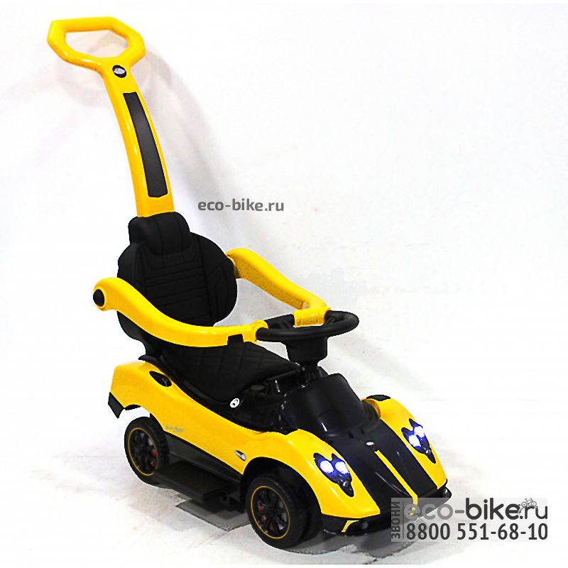 Включение происходит с помощью нажатия на кнопку. Не имеет пульт ДУ. Руль очень комфортный, управлять им можно спокойно, а еще на нем расположена кнопочка нажмите и услышите звук клаксона. Работает от 4-х батареек AA (не идут при заказе). Есть световые эффекты, которые не дадут потеряться ночью, ведь светятся передние и задние фары. Сиденье мягкое и кожаное. Колеса каучуковые, есть поворотный переключатель лицевых колес. Если ребенок устал ходить самостоятельно, он садится в толокар ноги ставит на подножки, которые выдвигаются. Удачно продумали родительскую ручку для управления машиной, на ней есть фиксаторы безопасности для поддержки малыша (крепятся к рулю), чтобы не смог выпасть во время катания. В таком случае, езда становится безопасной. Спинка съемная, в любой момент можно ее снять и поменять.